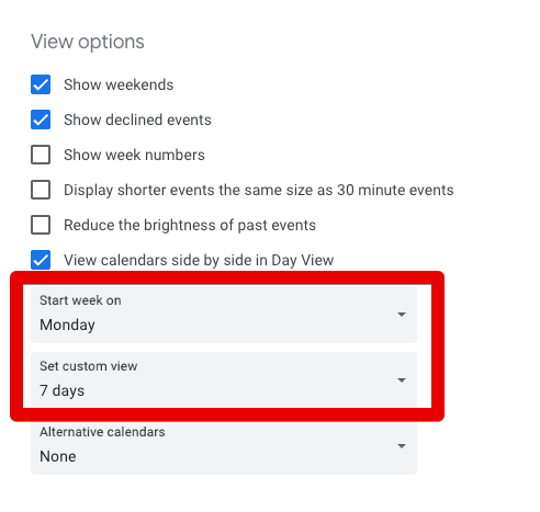 Upgrade to Monday start and whilst you’re at it there are a couple of other nuggets in the settings like “don’t show declined events” and to “show or don’t show weekends”.