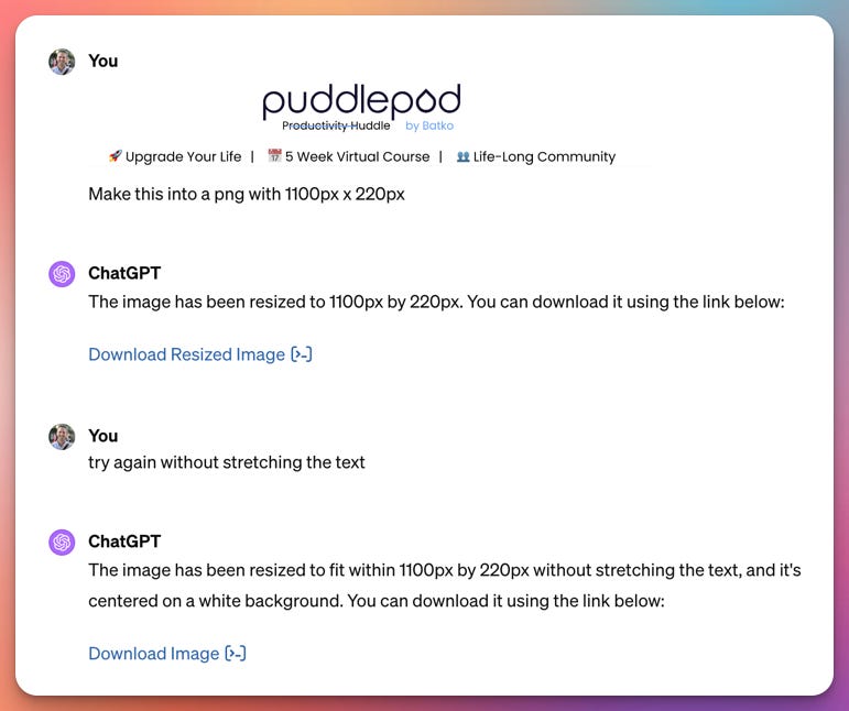 Upload image + “Make this into a jpeg/png of X x Y dimensions without stretching the text”