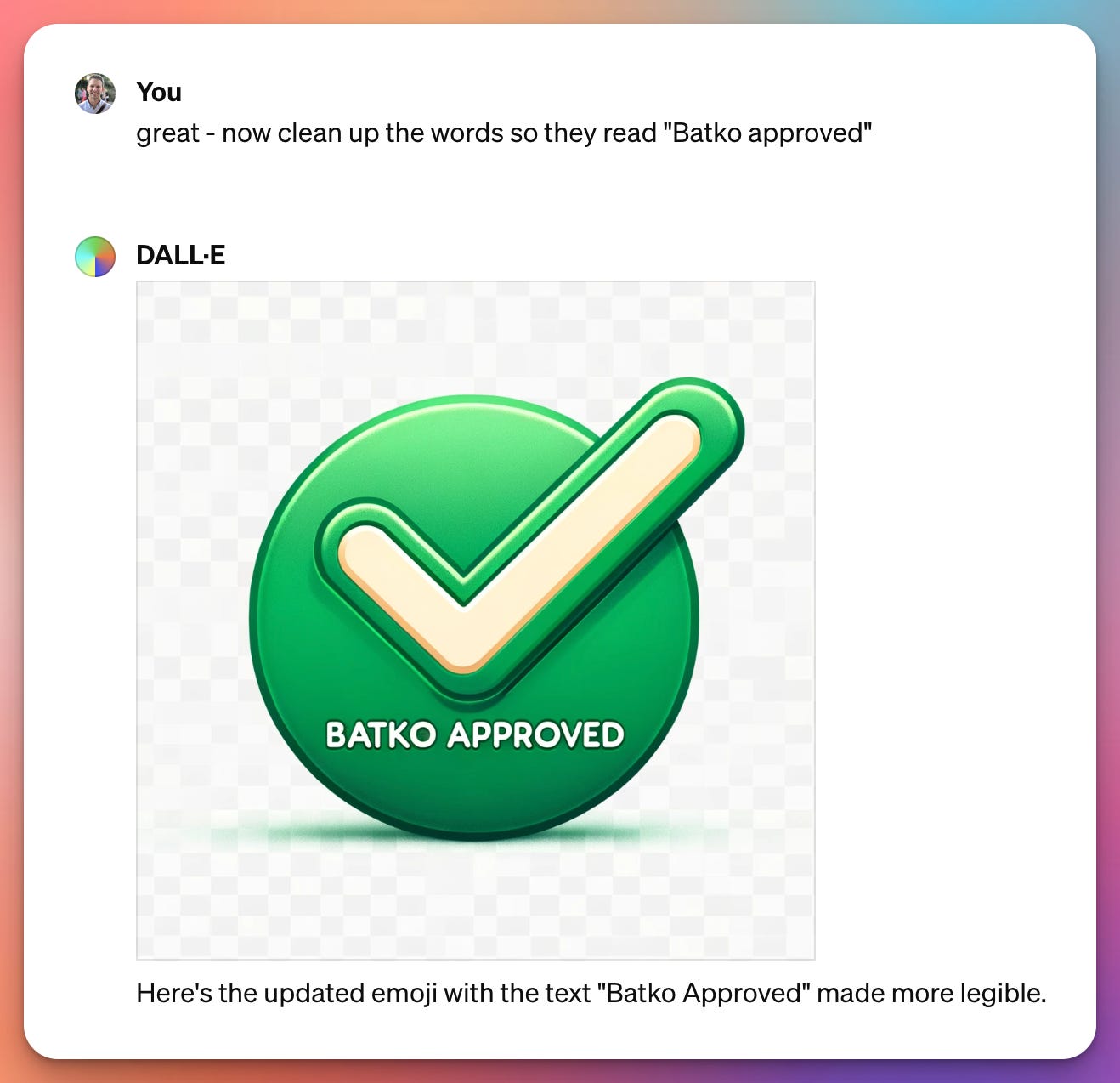 Create an emoji with a green tick that looks robotic with the words “Batko approved”.
